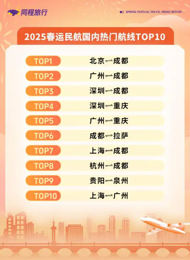今年春節流行“分段式過年” 首個“非遺”春節加上長達8天的假期,都讓今年春節旅游的熱度達到了新的高度。其中,來自攜程的數據顯示,重慶成為了“00后”出游和親子游家庭的最愛的目的地。飛豬的預測中“非遺游”熱度暴增,同程旅行的預訂數據中多條往返重慶的火車票、機票的熱度都居高不下。 成渝機票、火車票持續飄紅 出游熱度總是最先反映在機票、火車票的銷售上。根據攜程發布的《2025春節旅游市場預測報告》,在2025年春運火車票開售以來的一周里,從廣州、上海、深圳、北京、杭州等一線和新一線城市出發的旅客最多,哈爾濱、重慶、成都等地都是熱門目的地。 多條往返重慶航線機票熱度攀升 受放假新規施行的影響,除夕被正式納入了假期,2025年春節放假將長至8天,所以攜程的報告預測“分段出游”將是今年春節假期的風尚——請假提前2-3天返鄉和家人團聚,歡度除夕;然后在大年初一、初二開始自己的旅行。報告顯示,今年春節期間,國內游客大交通出行距離同比去年春節增長43%,3小時飛行圈內目的地最受游客歡迎。 而同程旅行發布的《2025春運旅行趨勢報告》也顯示,節前廣州、深圳、北京、上海、成都、重慶等都是鐵路的熱門出發城市,節后出游的高峰也相對集中在成都、鄭州、重慶、西安、深圳等地。與此同時,同程旅行的春運機票預訂數據顯示,深圳-重慶、廣州-重慶、北京-成都、廣州-成都等航線也都相對比較熱門。 重慶成為“00后”最愛出游目的地 首個“非遺”春節加上每年新春大家都格外鐘情的“年味”,讓今年春節的“年味游”格外火爆。在這方面有期待的市民可以從攜程發布的這組數據中尋找你想去的目的地——春節期間,泉州、潮州、汕頭、自貢、大同、興義等小眾目的地熱度飆升。預訂訂單來看,銅陵、黃山、大同、景德鎮、漳州增長明顯,同比去年增長約4倍。